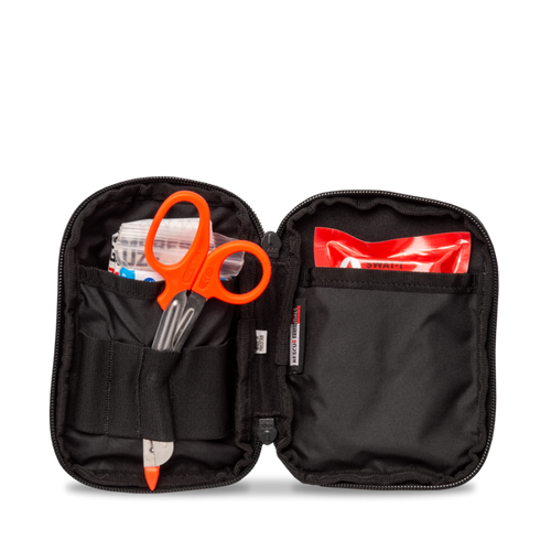 EDC-sized compact emergency med kit with tourniquet, gauze, and trauma tools. Pocket-ready first aid for bleeding control and emergencies.